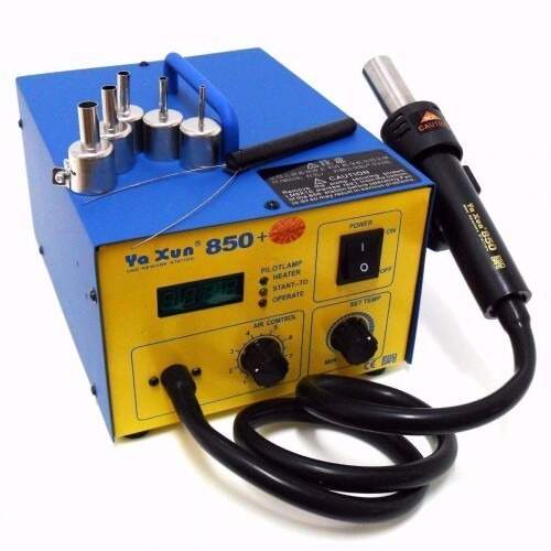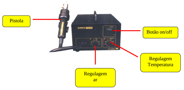 Instrumento essencial em qualquer bancada, pois tem a função de soldar e dessoldar o componente de tecnologia SMD e BGA. Executa o trabalho de retrabalho emitindo ar quente através de sua ponteira (com regulagem de ar e temperatura).
