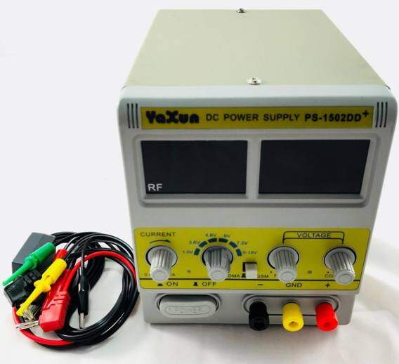 A Fonte de Tensão regulada tem a função de fornecer uma tensão que possibilite a alimentação do dispositivo a ser testado. A fonte mais comum utilizada é a de 15v e 2A, suficiente para o trabalho com aparelhos celulares. Alimentando o celular com uma bateria falsa conectada a fonte podemos verificar o consumo do aparelho sem teste e avaliar seu desempenho.