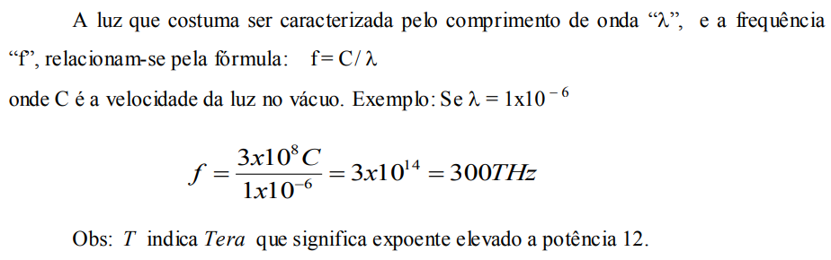 As indicações da região próximo do infravermelho com comprimento de onda entre 800 e 1800 nm (ou 0,8 a 1,8 m), são as que podem ser usadas para comunicações com Fibras Ópticas e estão mostradas na figura abaixo. As mesmas correspondem as chamadas JANELAS DE TRANSMISSÃO, 1ª, 2ª e 3ª janela respectivamente.