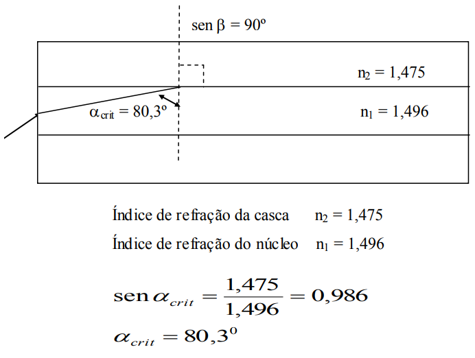 Quando um raio de luz ou modo de transmissão passa de um vidro com índice de refração maior (núcleo da fibra) para um vidro com menor índice de refração (casca da fibra), há uma mudança na direção do raio.