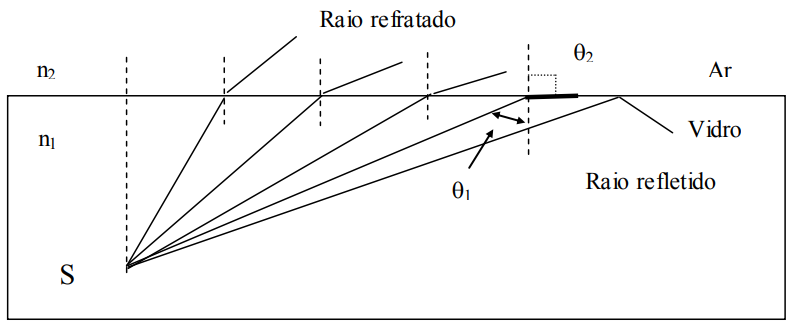 Consideremos um raio de luz num certo meio (vidro por exemplo), incidindo sobre uma superfície além da qual existe um meio com índice de refração n menor que o primeiro (ar). Verifica-se que , a medida em que o ângulo de incidência aumenta, chega-se a uma situação (raio e) em que o raio refratado sai tangente à superfície de refração igual a 90º. Para ângulos maiores que este ângulo critico “O2” não existe raio refratado, ocorrendo o fenômeno chamado REFLEXÃO INTERNA TOTAL.