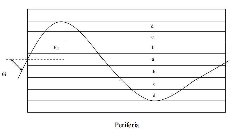 A seguir veremos um exemplo com várias substâncias colocadas em camadas, sendo que a substância mais refringente está exatamente no centro, e as substâncias menos refringentes estão colocadas do centro para a periferia, como mostrado na figura 9. Quando um raio monocromático incide na substância “a”, faz com este um ângulo de incidência “i”, ao sair de “a”, incide em “b” fazendo um ângulo “a” e assim sucessivamente até chegar em “d” onde haverá uma reflexão interna total. Após esta reflexão o raio monocromático retornará ao centro e sairá para a outra periferia. Concluímos que a trajetória deste raio monocromático forma uma forma senoidal, devido a seu ângulo de incidência e a diferença dos índices de refração.