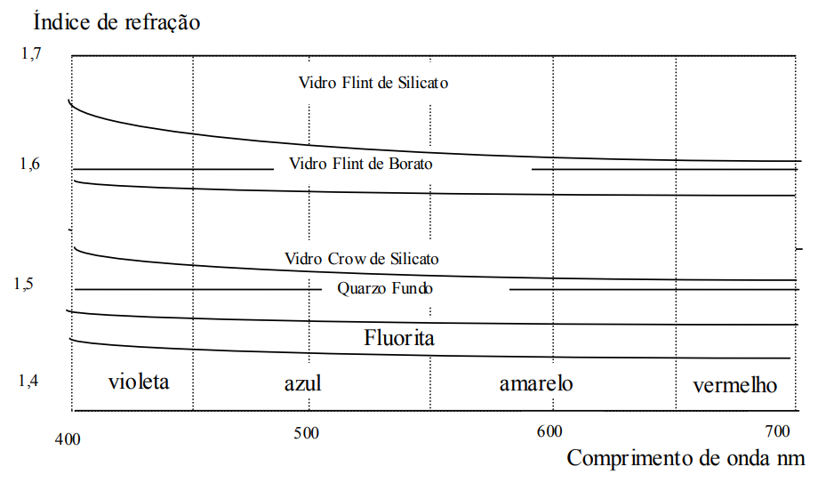 A dispersão material ocorre pelo fato de o índice de refração depender do comprimento da onda, causando diferenças entre as velocidades dos componentes espectrais da fonte de luz usada