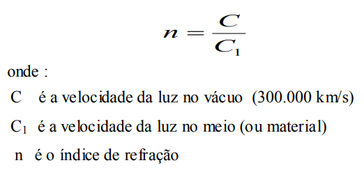 O índice de refração (n) é definido como a relação entre a velocidade de propagação da luz no vácuo e a velocidade da luz no material.