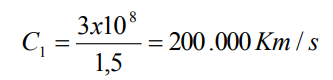 O que caracteriza um meio dielétrico cristalino, do ponto de vista óptico é seu índice de refração (n) e é ele que define o comprimento da luz ao passar de um meio para outro. Se o índice de refração de um material é n = 1,5 então sua velocidade no meio será de: