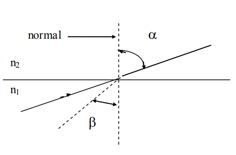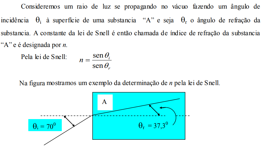 Quando um feixe de luz monocromática (somente um comprimento de onda) passa por um meio com índice de refração n1 para outro meio com índice de refração n2, este muda de direção conforme o ângulo de incidência;