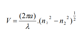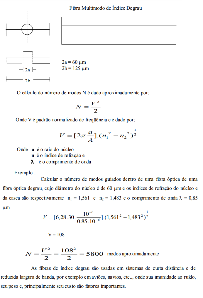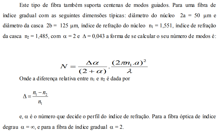 Vamos calcular para os dois tipos de fibras, o número de modos (aproximado), sendo que as duas fibras são idênticas tanto no diâmetro do núcleo e da casca como no índice de refração (usar os números de índice gradual).