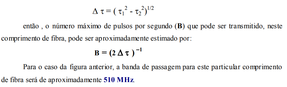 Observe que, se usarmos um LASER como fonte de luz (com largura espectral de 2 nm ) como fonte de luz, e uma fibra multimodo de índice gradual, a dispersão será quase que totalmente reduzida; porem, se usarmos uma fibra monomodo praticamente não haverá dispersão modal e nem a dispersão material. Desta forma, a banda de passagem nesta última fibra, será da ordem de 10 GHz