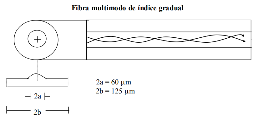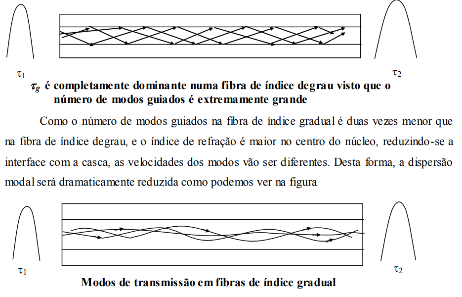 Note-se que o número de modos guiados nesta fibra é duas vezes menor (aproximadamente) que na fibra de índice degrau. As fibras de índice degrau são apropriadas para sistemas de comunicações que requerem extensa largura de faixa, ou para sistemas de elevadas taxas de bits, sendo usadas também em redes de comunicações em longas distâncias.