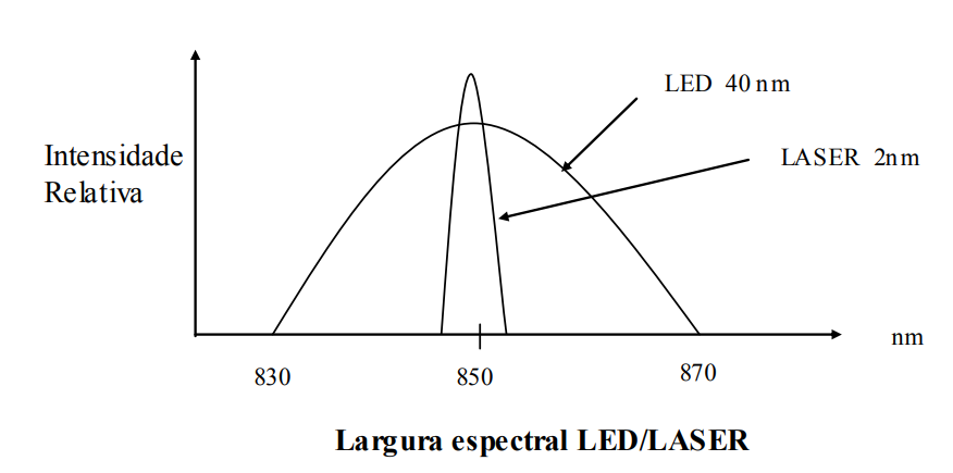 - Mesmo quando se usa o Diodo Emissor de Luz (LED) com largura espectral de 40 nm como fonte de luz, Tm é insignificante quando comparada com Tg na fibra degrau, porem, na fibra de índice gradual, se usarmos a mesma fonte de luz, m é maior que g. Na figura 24 temos a largura do LED e do LASER.