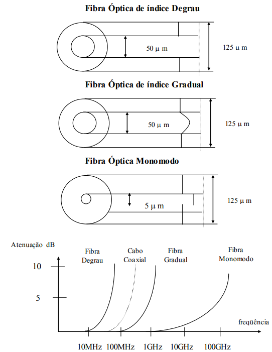 OBSERVAÇÃO: note-se que a banda de passagem tem aumentado de fibra para fibra, com a diminuição dos modos de propagação.
