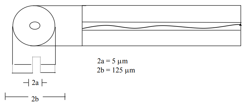Neste tipo de fibra, o diâmetro do núcleo 2a = 5 um e é muito menor que o diâmetro da casca 2b = 125 um. O índice de refração da casca (n2) é ligeiramente menor que o índice de refração do núcleo (n1). Valores típicos n1 = 1,471 e n2 =1,457.