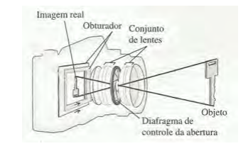 O filme fotográfico (conversor eletrônico), é colocado no interior de uma câmara escura; o diafragma controla a quantidade de luz que ai penetra e o obturador regula o intervalo de tempo durante o qual o filme fica exposto à luz. A Figura 6.1, ilustra uma câmera fotográfica com alguns detalhes.