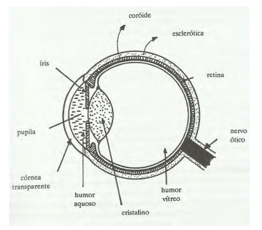 Segundo GREF (2005), o olho humano é um órgão aproximadamente esférico, com diâmetro em torno de 25 mm e constituído basicamente por: