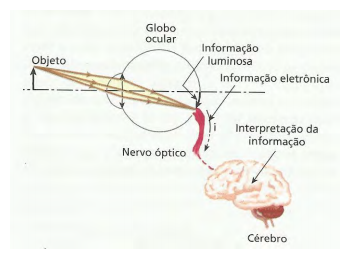O sistema óptico do globo ocular conjuga aos objetos uma imagem real e invertida, projetada na retina que transforma as informações luminosas que lá incidem em sinais elétricos que vão do nervo óptico até o cérebro onde são interpretadas. A Figura 6.4 ilustra esse processo.