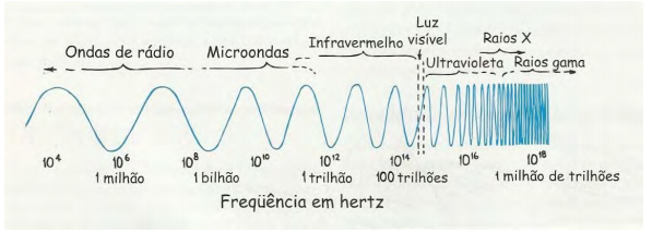 Segundo HEWITT (2002), a classificação das ondas eletromagnéticas, baseada na frequência, constitui o espectro eletromagnético, ilustrado na Figura 6.5, em frequência crescente.