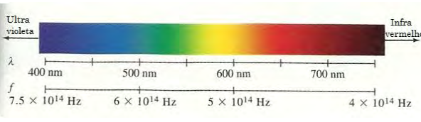 A Figura 6.6 ilustra o espectro de luz visível, mostrando a variação das frequências, em ordem decrescente, e comprimentos de onda pra várias cores.