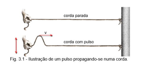 Define-se uma onda como qualquer perturbação que atravesse um determinado meio sem transportar partículas desse meio. Por exemplo, as ondas do mar andam sobre a sua superfície sem entanto carregar as moléculas de água deste junto com ela. Na corda abaixo o pulso de onda viaja sobre esta e, no entanto a corda continua presa ou fixa entre a parede e a mão da pessoa que a segura. O que vemos se deslocar sobre o meio é o perfil da onda, ou seja, a perturbação sobre este.