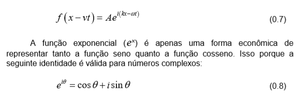 Veremos mais tarde que w é a frequência angular da onda. Numa onda harmônica é usual representar o seu perfil através da função exponencial com argumento puramente imaginário. Ou seja, representamos a onda pela função