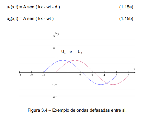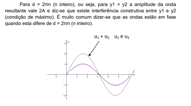 Os efeitos físicos associados à superposição de duas ou mais ondas são chamados de interferência. Como exemplo clássico considere duas ondas de mesma direção e sentido, mas uma atrasada em relação à outra de uma fase d. Se elas possuem frequências, amplitudes e velocidades iguais têm-se: