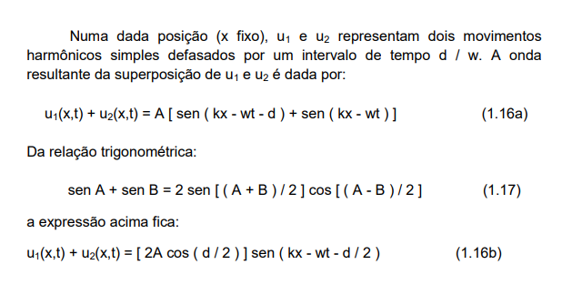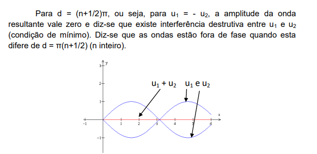 Portanto, a onda resultante é uma onda com mesma frequência angular w que as ondas descritas por U1 e U2 e com fase d/2. Mas a sua amplitude é dada pelo fator 2A cos ( d / 2 ).