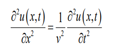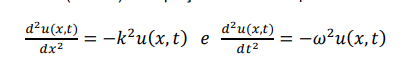 Onde o parâmetro v aparecendo na equação acima é a velocidade de propagação da onda no meio. Se substituirmos a função de onda u(x,t) = A.cos(k.x-ω.t) na equação de onda e aplicarmos as derivadas parciais, temos:
