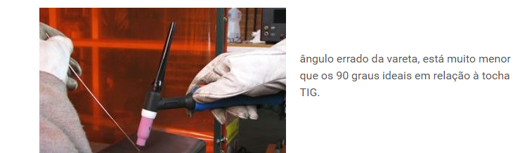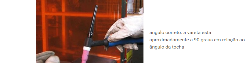 Durante uma soldagem com o processo TIG, deve adicionar o material através de varetas feitas do material que deseja adicionar, diretamente na poça de solda, em um ângulo de 90 graus com relação à tocha.
