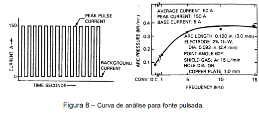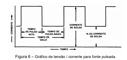 A corrente contínua pulsada envolve a variação repetitiva da corrente do arco entre um valor mínimo ( “background” ) e um valor máximo, controlando-se o tempo do pulso, o tempo no valor mínimo, nível de corrente máximo e nível de corrente mínimo.