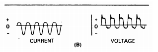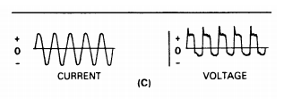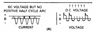 A CA é de grande utilidade em GTAW, pois combina a limpeza catódica do processo com o eletrodo no pólo positivo, com a penetração mais profunda do eletrodo negativo. Entretanto, quando em operação, diversos fenômenos podem ocorrer e devem ser analisados. Ao tornar-se negativo, o eletrodo termoiônico de tungstênio provê elétrons para a reignição do arco, imediatamente após ter passado pelo ponto de corrente zero. Entretanto, ao tornar-se positivo o mesmo não ocorrerá, pois a poça não poderá suprir elétrons até que um determinado nível de tensão seja atingido. Isto deriva de diferentes aspectos como área mais extensa da poça, material menos termoiônico e inércia na mudança de direção dos elétrons. Este efeito pode ser acompanhado pela figura abaixo.