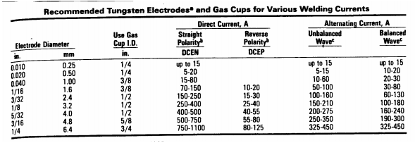 Os eletrodos são produzidos através de acabamento químico ou mecânico para remoção de imperfeições e impurezas na sua superfície. As capacidades de corrente dos eletrodos devem ser respeitadas ( tabela anterior ) e a sua utilização acima de seu limite causará erosão ou fundição do eletrodo. Com correntes muito baixas haverá instabilidade no arco. Devido ao superaquecimento que provoca, a utilização de eletrodo como pólo positivo em CC ( corrente contínua ) necessita de diâmetros de eletrodos bastante superiores para uma mesma corrente, comparativamente com DCEN ( corrente contínua com eletrodo no pólo negativo ). DCEP ( corrente contínua com eletrodo no pólo positivo ), desta forma, permite uma corrente de apenas aproximadamente 10 % da utilizada para um mesmo eletrodo em DCEN. A corrente para CA ( corrente alternada ) é da ordem de 50 % da corrente em DCEN, para um mesmo eletrodo.