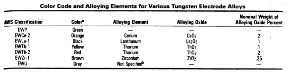No processo GTAW os eletrodos não são consumíveis e tem o papel de servir como um dos terminais do arco que irá gerar o calor para o processo. Ao aproximar-se da sua temperatura de fusão (3410 ºC), o tungstênio torna-se termoiônico, como uma fonte disponível de elétrons. Ele alcança esta temperatura através de aquecimento por resistência e, caso não houvesse um forte efeito de resfriamento pela saída dos elétrons de sua extremidade, esta ponta poderia fundir-se. Os eletrodos são classificados com base em sua composição química, como na tabela abaixo