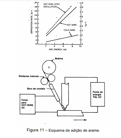 A alimentação do arame que servirá de adição à solda nos processo automatizados ou mecanizados pode ser feita tanto à temperatura ambiente quanto pré-aquecida, sendo estes processos designados como arame frio e arame quente, respectivamente. O arame frio é alimentado no início da poça enquanto o arame quente é alimentado no final da poça. O sistema de alimentação do arame frio é composto pelo mecanismo de alimentação, pelo controle de velocidade e pela guia de alimentação. No processo de arame quente há um pré-aquecimento por resistência elétrica. O arame é alimentado mecanicamente e recebe uma proteção de gás auxiliar para evitar a sua oxidação. As taxas de deposição obtidas através deste método são comparáveis às obtidas em GMAW. O arame é aquecido por uma fonte que opera em CA e tensão constante. A CA permite a operação desta fonte com mínima sopragem do arco. O método, entretanto, não é recomendado para alumínio e cobre pois, devido à sua baixa resistência, estes materiais requerem correntes elevadas para o aquecimento que, por sua vez, acarretam uma deflexão excessiva do arco.