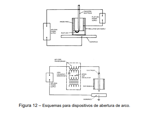 O método mais simples de iniciação do arco, o toque do eletrodo na peça, apesar de extremamente simples, não é recomendado, pois ao tocar a peça o eletrodo pode contaminá-la e danificar-se. Outro método é a utilização de uma fonte de alta frequência, que fornece uma alta tensão com alta frequência em série ao circuito de soldagem, para ionizar o gás e permitir a abertura do arco e poder trabalhar com uma corrente igual à corrente de soldagem ou não. Este método tem o inconveniente de gerar grande quantidade de distúrbios para a rede de alimentação elétrica.