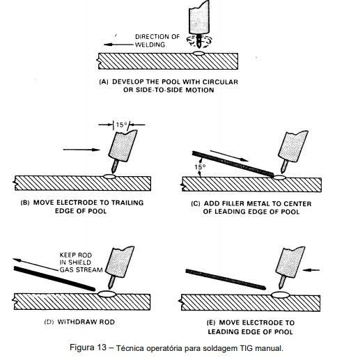 estabelecimento da poça de soldagem. A tocha é então inclinada em 15 graus conforme a figura abaixo e é movida ao longo da junta para fundir progressivamente as superfícies. O material de adição é adicionado, se frio, no início da poça. A figura abaixo ilustra o processo de soldagem manual. Deve-se tomar especial cuidado para manter sempre a ponta do arame de adição dentro do fluxo do gás de proteção.