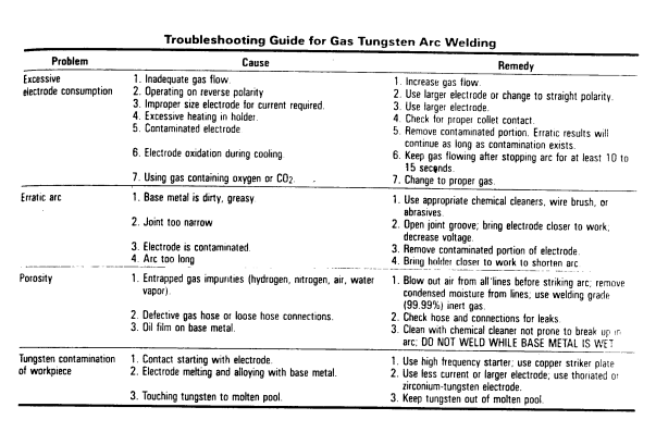 A falta de proteção no processo está relacionada a descontinuidades como inclusão de tungstênio, porosidade, filmes óxidos e inclusões, fusão incompleta e fissuras. A tabela que segue ilustra os principais defeitos suas causas e forma de correção :