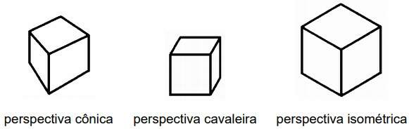 Existem diferentes tipos de perspectiva. Veja como fica a representação de um cubo em três tipos diferentes de perspectiva: