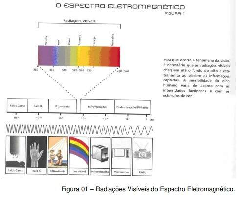 O espectro eletromagnético contém uma série de radiações de diferentes frequências e comprimentos de onda (figura 1). Entretanto, o que percebemos como energia visível ou luz visível encontra-se apenas em uma pequena faixa deste espectro. A retina do olho humano é estimulada e produz sensações luminosas entre os comprimentos de onda de aproximadamente 380 nm a 760 nm e está limitado pelas radiações infravermelhas (de maior comprimento de onda) e ultravioletas (de menor comprimento de onda). Para que ocorra o fenômeno da visão, essas radiações eletromagnéticas devem chegar até o fundo do olho e este irá transmitir ao cérebro as informações captadas.