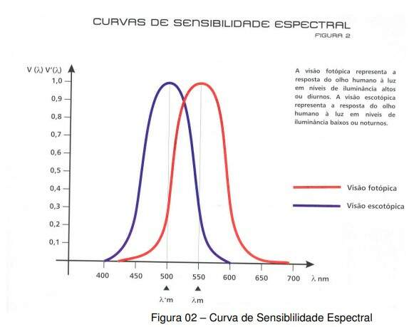 A sensibilidade do olho humano varia de acordo com as intensidades luminosas e com os estímulos de cor e esta está diretamente relacionada ao comprimento de onda da radiação. Diferentes comprimentos de ondas produzem sensações distintas de luminosidade. Para cada cor do espectro visível, o olho humano tem uma sensibilidade distinta (Negrão, 2005).