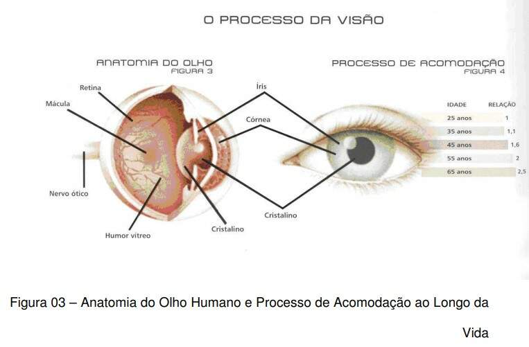 Segundo Costa (2005), o olho humano vai envelhecendo e, em particular, antes dos 60 anos já existe uma extrema necessidade de óculos que visam corrigir a acuidade visual. “Os líquidos ou humores aquoso e vítreo, presentes no interior do globo ocular, bem como o cristalino e a córnea, começam a alterar os índices de refração e a sua coloração” (ibid, 2005, p.61). Como conseqüência, o idoso passa a enxergar de uma forma mais amarelada, daí resultando a necessidade de mais luz para enxergar do que um jovem. O idoso também irá necessitar de maior iluminância para enxergar, que conforme as recomendações da IESNA (Sociedade de Engenharia de Iluminação Norte Americana) se traduzem pelo dobro da necessidade usual (ibid, 2005).