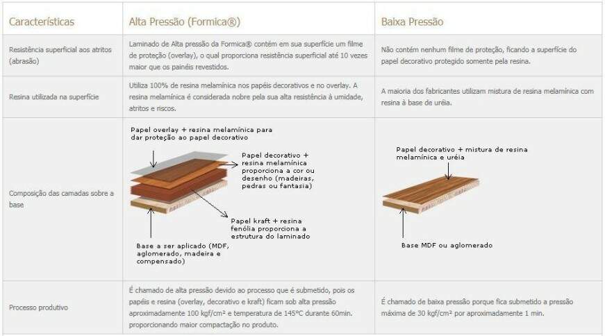 Os pontos negativos da laqueação é que ela não abre possibilidade para manutenção, sendo que, dependendo do dano (a laca lasca com certa facilidade) é necessário realizar novamente a pintura. Além disso a limpeza deve ser feita com cuidado para que não apareçam riscos indesejados e também a limpeza nunca deve ser feita com produtos abrasivos. Laminado Melamínico ou Melamina ou "Fórmica" ou Laminado Plástico, tipo de revestimento feito de folhas de celulose (papel) prensado com resina a altíssima pressão e utilizadas coladas sobre materiais diversos tendo diversas texturas e padronagens, atualmente se fabrica com camada de folha de alumínio ou metal o que dá aparência de metal, sendo de custo mais elevado, dimensões médias 1,25x2,51 ou x3,05m espessuras de 0,8 a 1,2 mm, sendo a mais grossa para colagem sobre emboço.