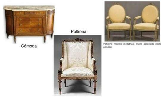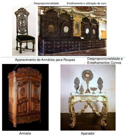 Seguindo o modelo de colonização vigente à época, Portugal não fixou no Brasil unidades manufatureiras, dedicavam-se somente à exploração dos recursos naturais da colônia e o seu envio à metrópole, assim não temos uma produção moveleira nesse período. Os primeiros móveis vieram com os colonizadores e eram produzidos em Portugal com madeira do Brasil. Já a partir do século XVII surgem os móveis fabricados no Brasil, mas seguindo copiosamente o modelo Português. Duas características marcam os móveis produzidos no Brasil: são híbridos e a linguagem é tardia, porque os estilos que imperavam na Europa só chegam ao continente Sul Americano com várias décadas de diferença. O chamado Estilo Nacional Português possui características do Maneirismo e do Renascimento, é pesado, sério, possui uma mistura de vocabulários, predominam as madeiras escuras. Durante o século XVIII, na primeira metade impera o chamado estilo joanino, móveis com pés de bola, decoração com folhas de acanto, talha profunda, pernas extremamente arqueadas, continuando o estilo pesado e sóbrio, é omóvelBarroco, que vai ser misturado ao estilo rococó. Os encostos passam a ser vazada, com uma tabela ao centro, no estilo Rainha Anne, com cadeiras de assento de couro e espaldar alto, surgem às cadeiras com assento de palhinha e desenhos imitando as formas de figuras femininas, decoradas com os feixes de plumas. Na metade seguinte vai surgir o estilo José I, fortemente influenciado pelo estilo francês e inglês, principalmente o vocabulário estético das rocalhas, a talha menos profunda, o estilo liso de grande parte das peças, reservando os entalhes para as laterais dos móveis e alguns detalhes, as pernas das cadeiras se tornam mais esguias. No século XIX com a chegada de João XVI ao Brasil vai reinar o móvel estilo D.Maria I, derivado do estilo neoclássico inglês, desaparece o cabriolé, os móveis são agora cobertos por veludos de tons escuros, desaparecem os entalhes predominando as incrustações de madrepérola e madeira. Na segunda metade do século XIX o Brasil se rende ao estilo Império, os móveis assumem formas mais clássicas, mais retilíneas, maior simetria, ferragens trabalhadas e dependentes da arquitetura. Os entalhes na madeira (em geral jacarandá) são bem mais leves e com motivos ornamentais da fauna e da flora brasileiras.