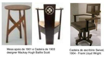 CARACTERÍSTICAS GERAIS DO MOBILIÁRIO –Linhas retas, inspirada nas linhas da natureza, preocupação com o artesanal, separação da indústria, revival do renascimento, islamismo, retilíneo e anguloso, com estilizados motivos decorativos;