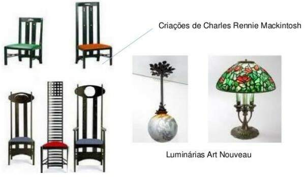 CARACTERÍSTICAS GERAIS DO MOBILIÁRIO – formas curvas, superelaboradas, influência da arte japonesa, formas góticas, esguias, dependente da arquitetura, sinuosidade, materiais inusitados, predominância do ferro e do vidro;