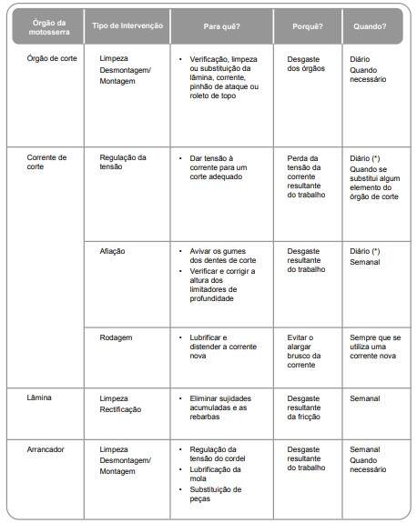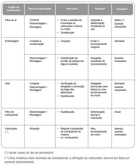 Uma manutenção cuidada, periódica e regular melhora o rendimento do trabalho e prolonga o tempo de vida útil da motosserra. Além disso contribui para uma eventual diminuição dos riscos associados à sua utilização. Cada tipo de intervenção deve obedecer a uma periodicidade adequada.