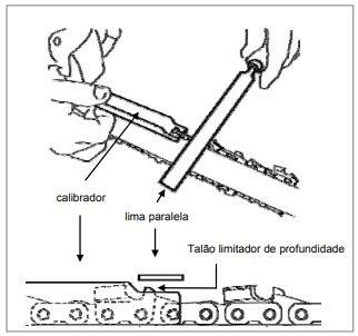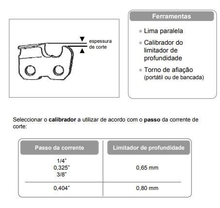 Com o uso e a afiação da corrente, a diferença de nível entre a aba superior do dente de corte e o limitador de profundidade, que determina a espessura ou profundidade de corte da corrente, diminui.