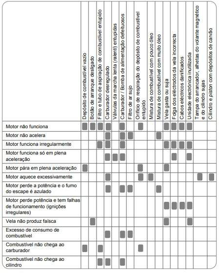 Os quadros apresentam algumas possíveis avarias e respectivas causas.