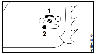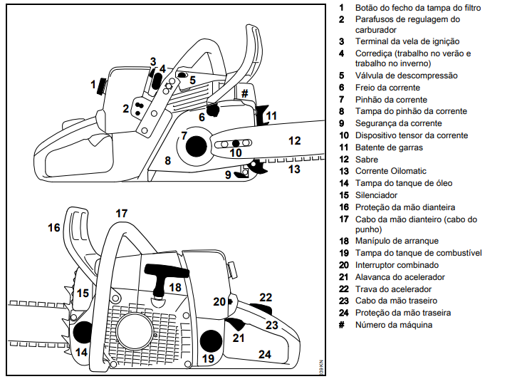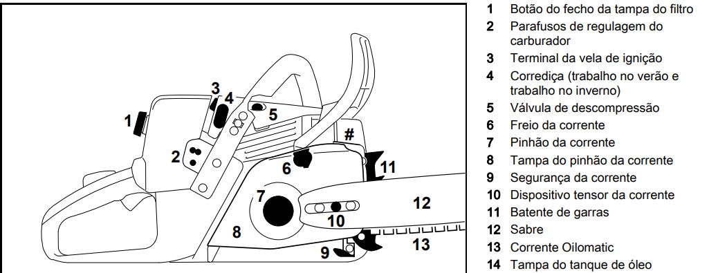 Corrediça (trabalho no verão e trabalho no inverno): Ajuste que permite a operação eficiente da motosserra em diferentes condições climáticas, prevenindo problemas como o congelamento do carburador.