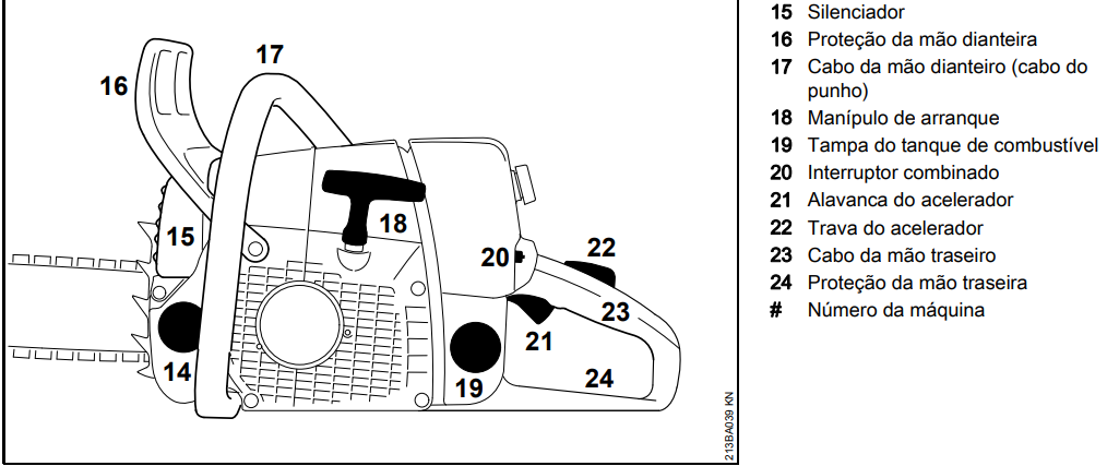 Cabo da mão traseiro: Parte da motosserra onde o operador segura com a mão traseira, proporcionando controle adicional.