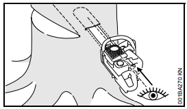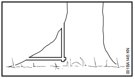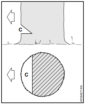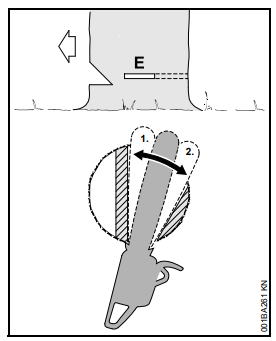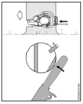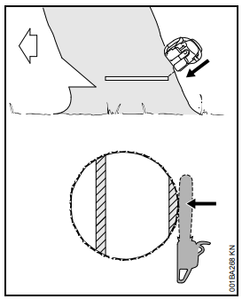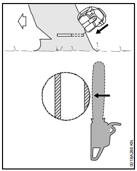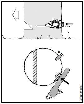 Acelerar a motosserra, firmá-la na árvore com auxílio do batente de garras e somente então iniciar o corte.