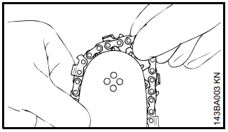 Tipo de corrente de motosserra que inclui orifícios para melhor lubrificação, prolongando a vida útil da corrente e do sabre.